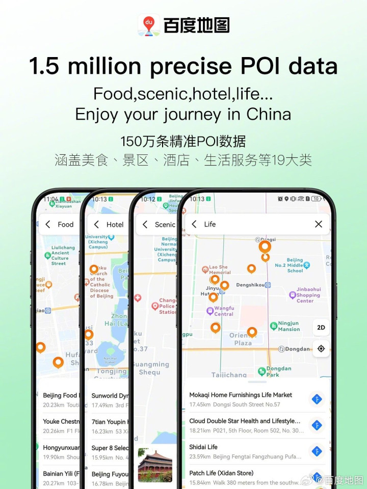 据介绍,百度地图为BeijingMap构建超过150万条精准POI数据,涵盖美食、酒店、生活服务等19大类、100余子类,宣称“全方位满足步行、骑行、公交、驾车等多元出行导航诉求”。